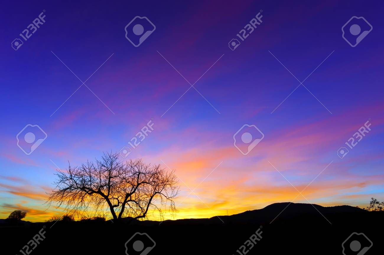 Abstract Colorful Sunset Landscape With Tree Silhouette On Front