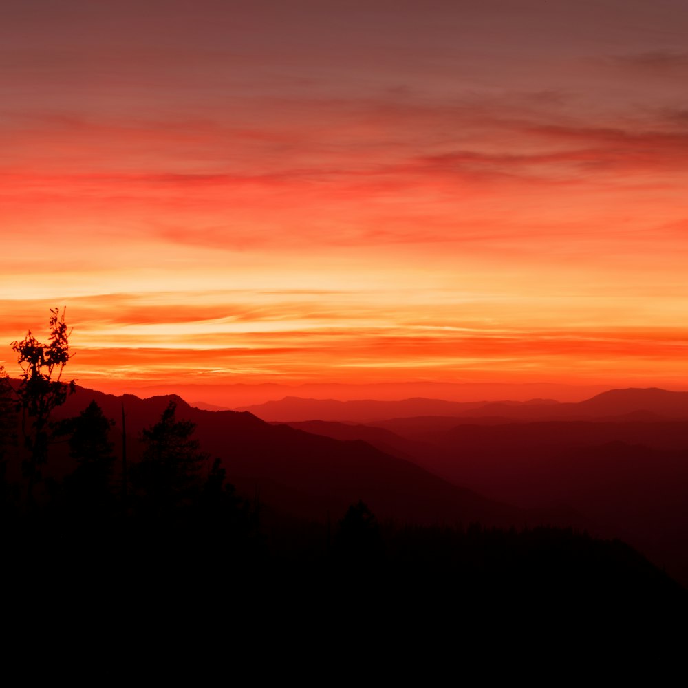 Orange Sky At Sunset Over Silhouette Of Trees In Field Photo