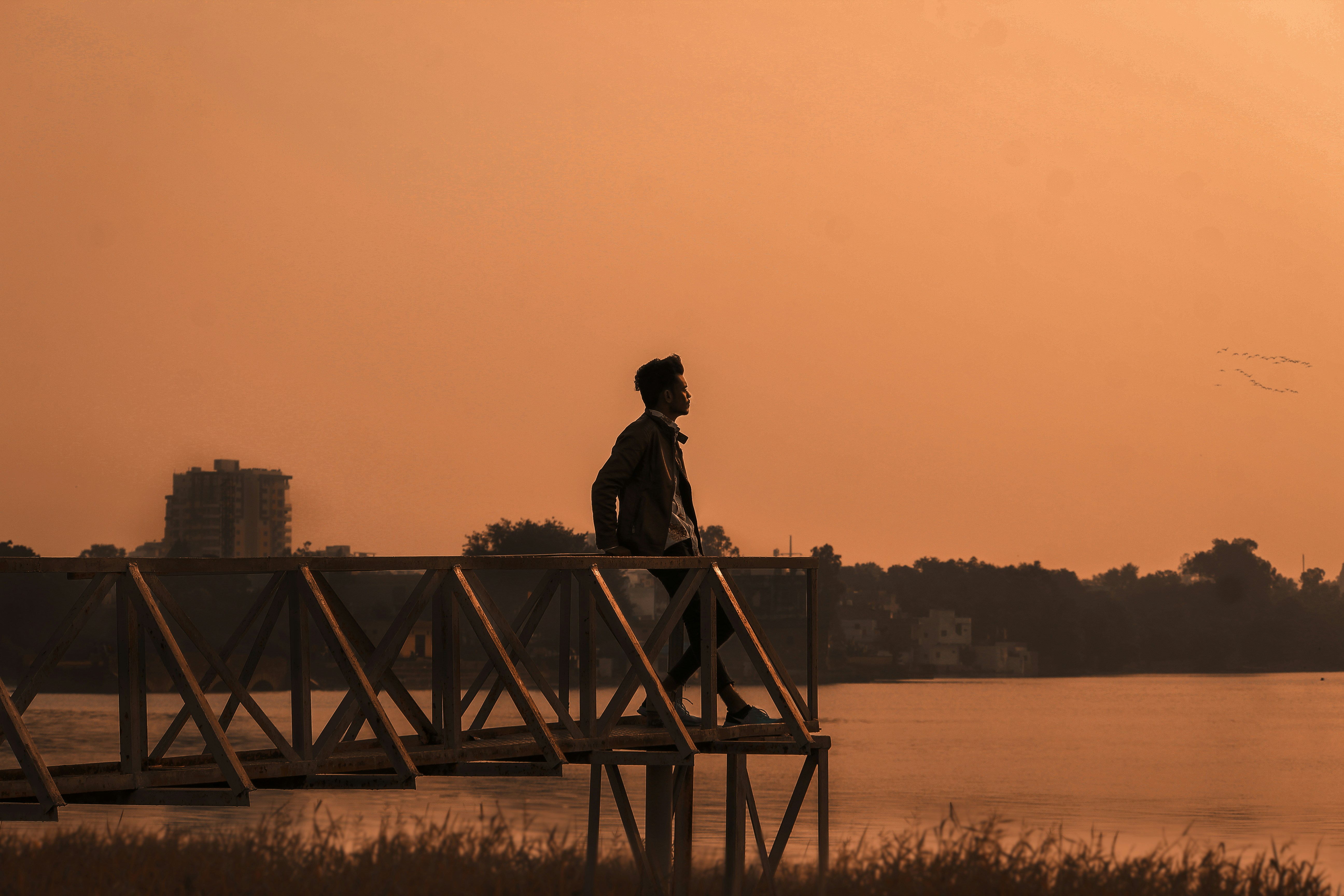 Silhouette Of Man Standing On Wooden Dock During Sunset Photo