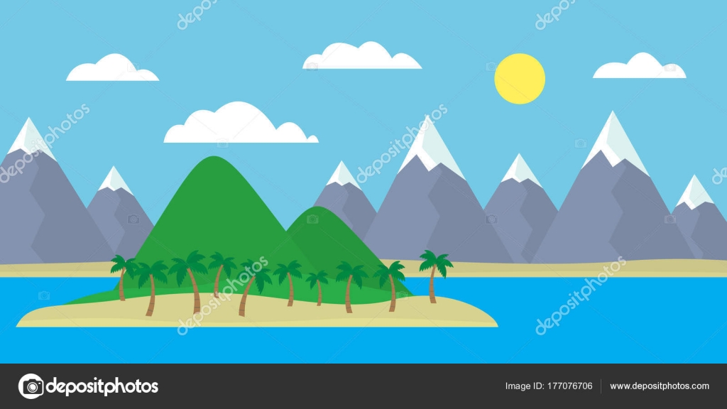 Mountain Cartoon View Of An Island In The Sea With Green Hills