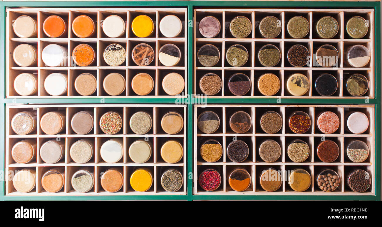Large Amount Of Glass Jars Filled With Various Colorful Spices And