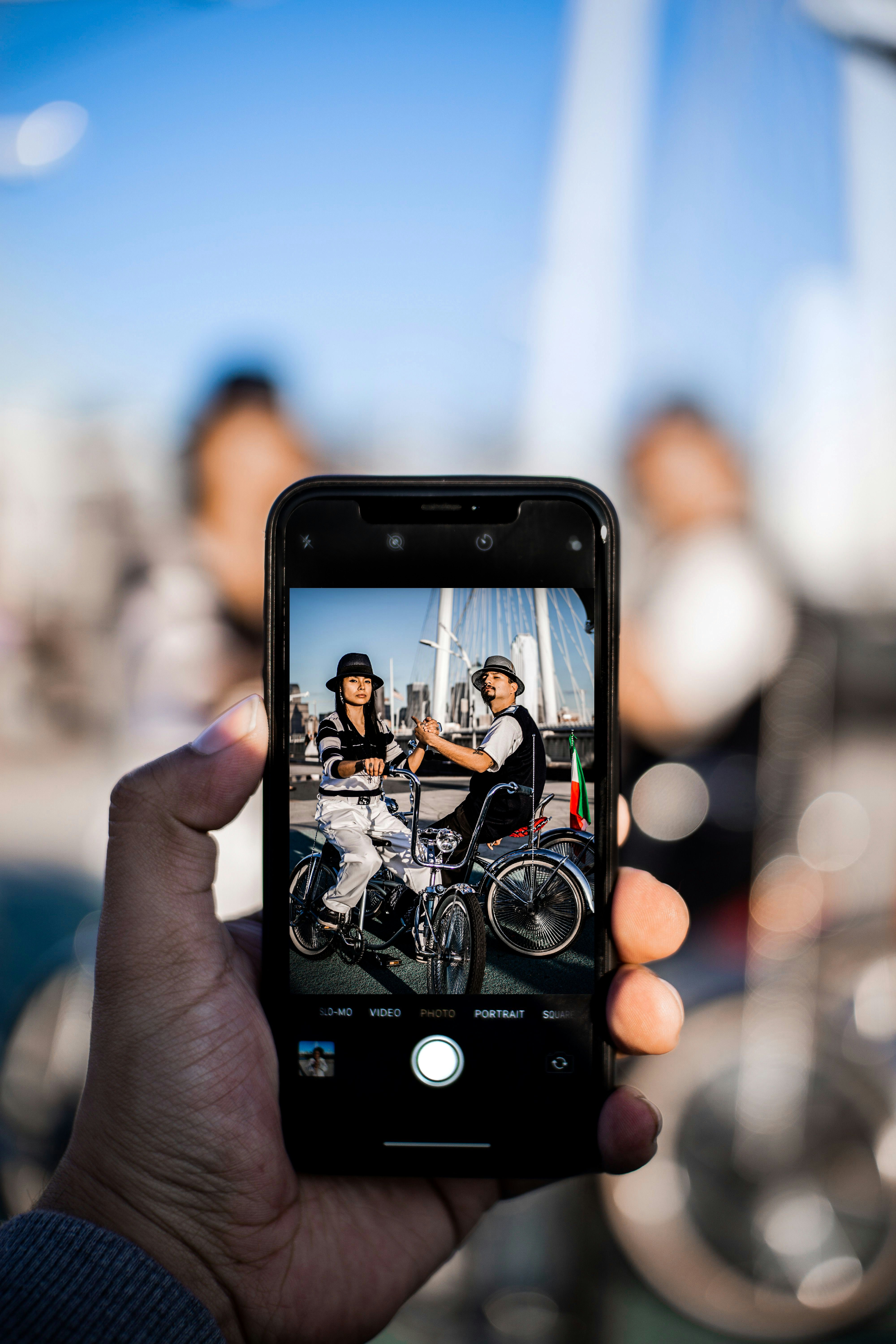 Person Capturing Two Person While Riding On Bicycle Photo Free