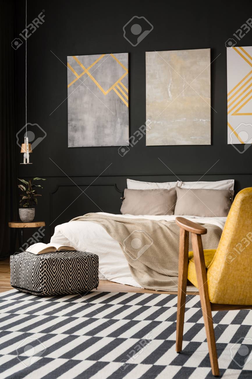 Big Comfortable Bed In Vintage Room Interior With Retro Chair