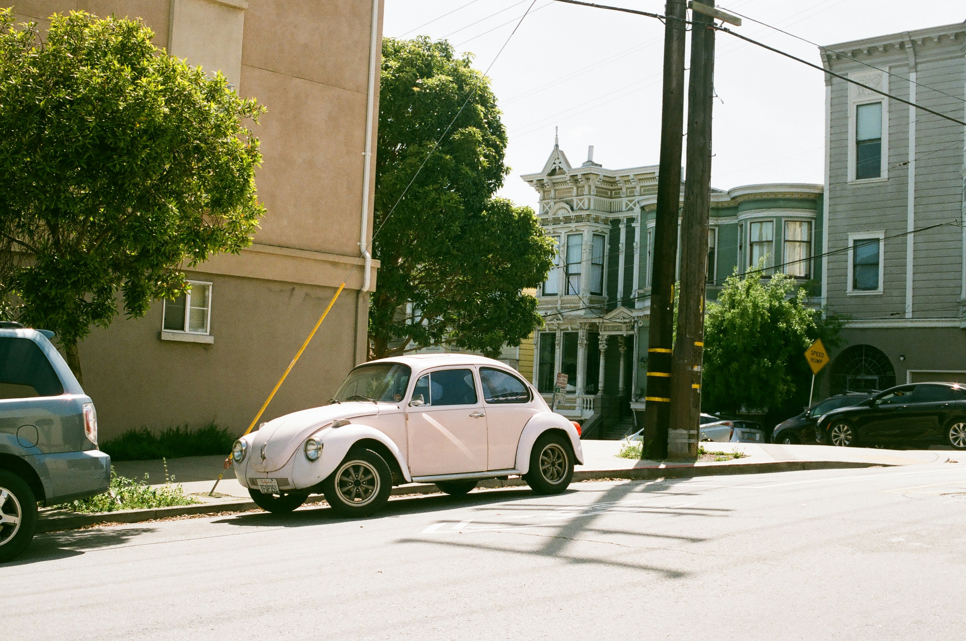 White Coupe Parked Beside Gray Concrete Building During Daytime