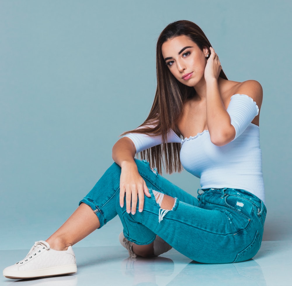 Woman In White T Shirt And Blue Denim Jeans Sitting On Black Metal