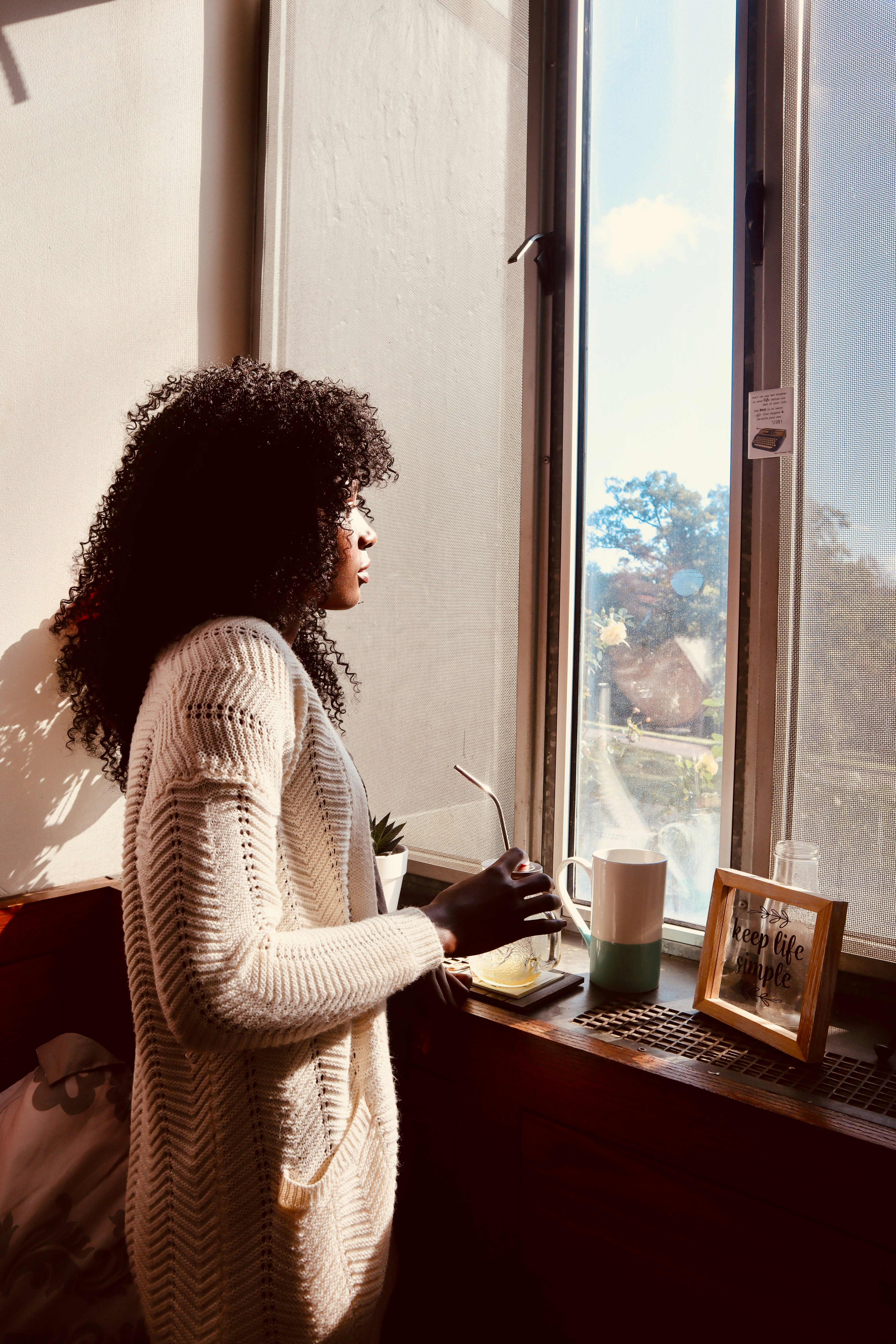 Woman In Beige Long Sleeved Dress Facing Window Photo Free Human