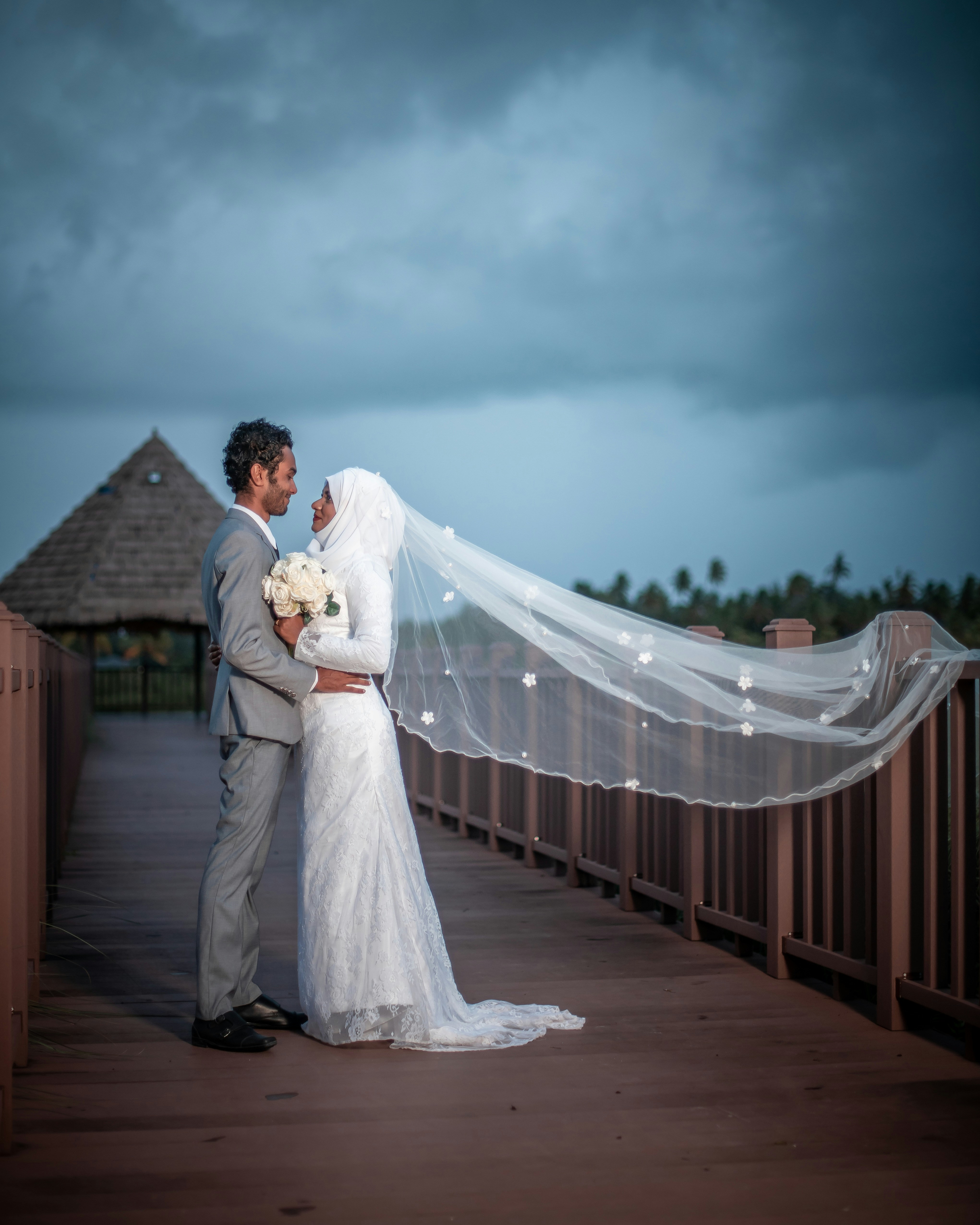 Man In Gray Suit Standing Beside Woman In White Wedding Gown At