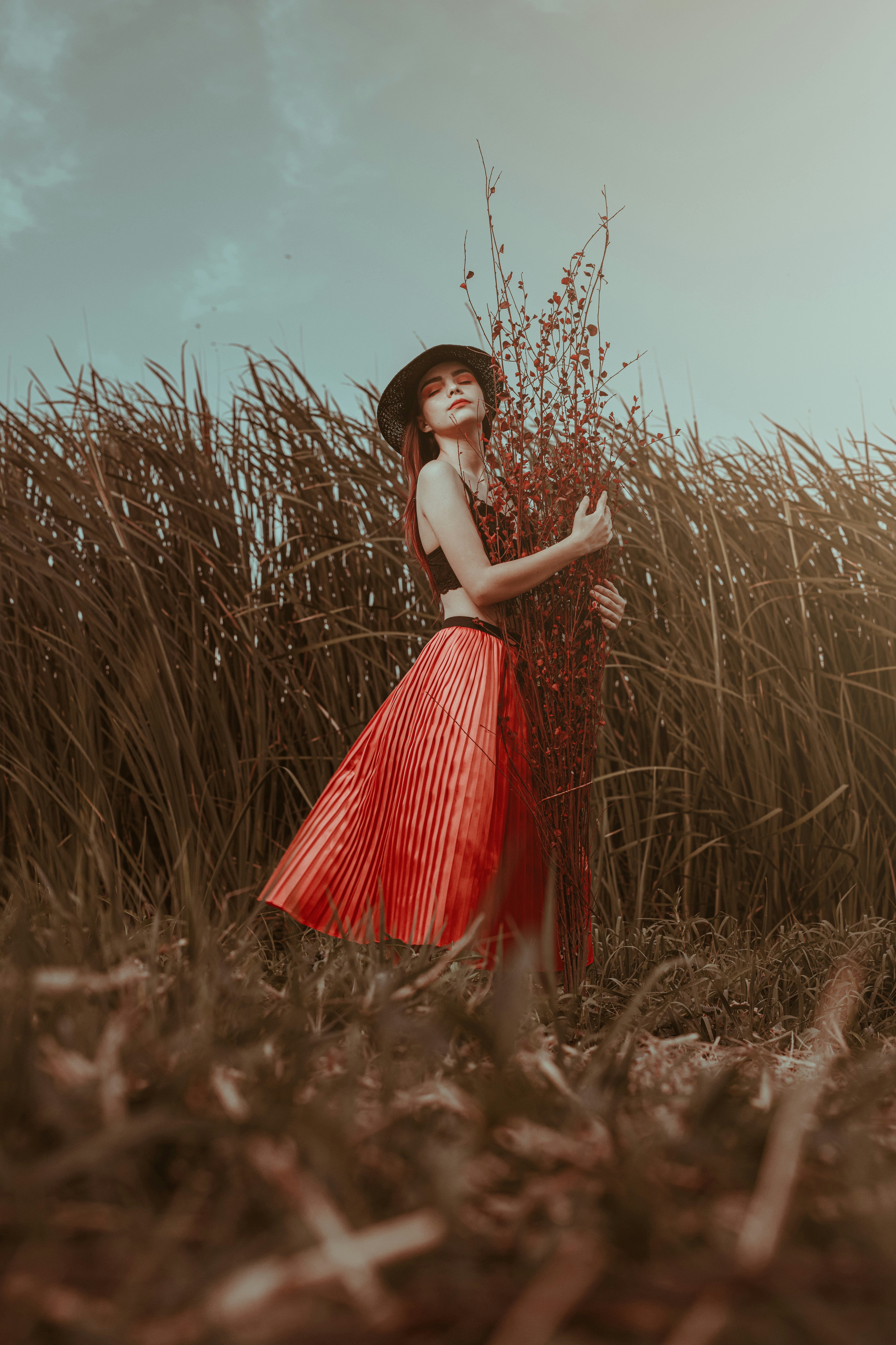 Woman In Red And White Dress Standing On Brown Grass Field During