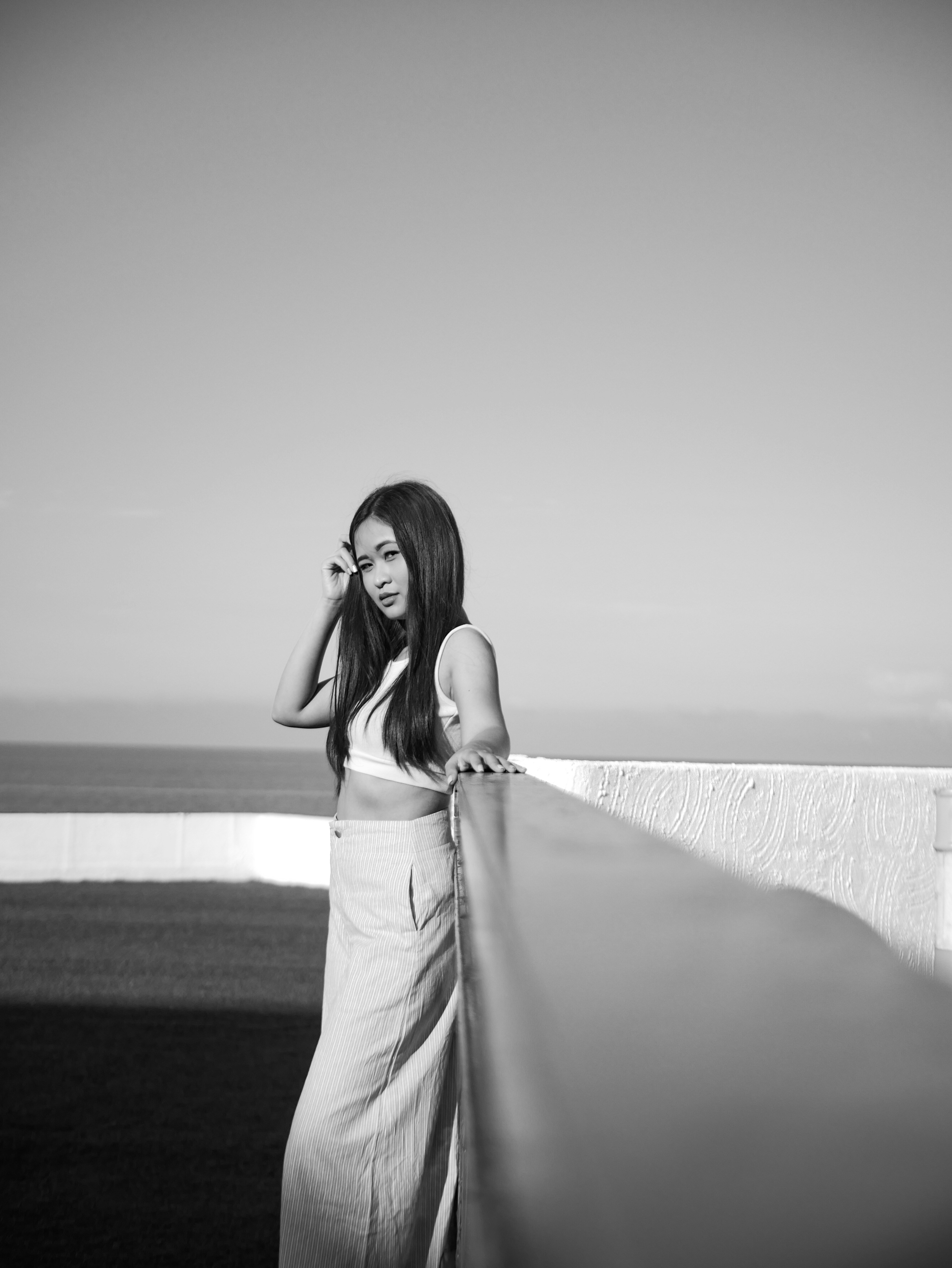 Hd Wallpaper Woman Leaning On Black Handrail Woman In White Crew
