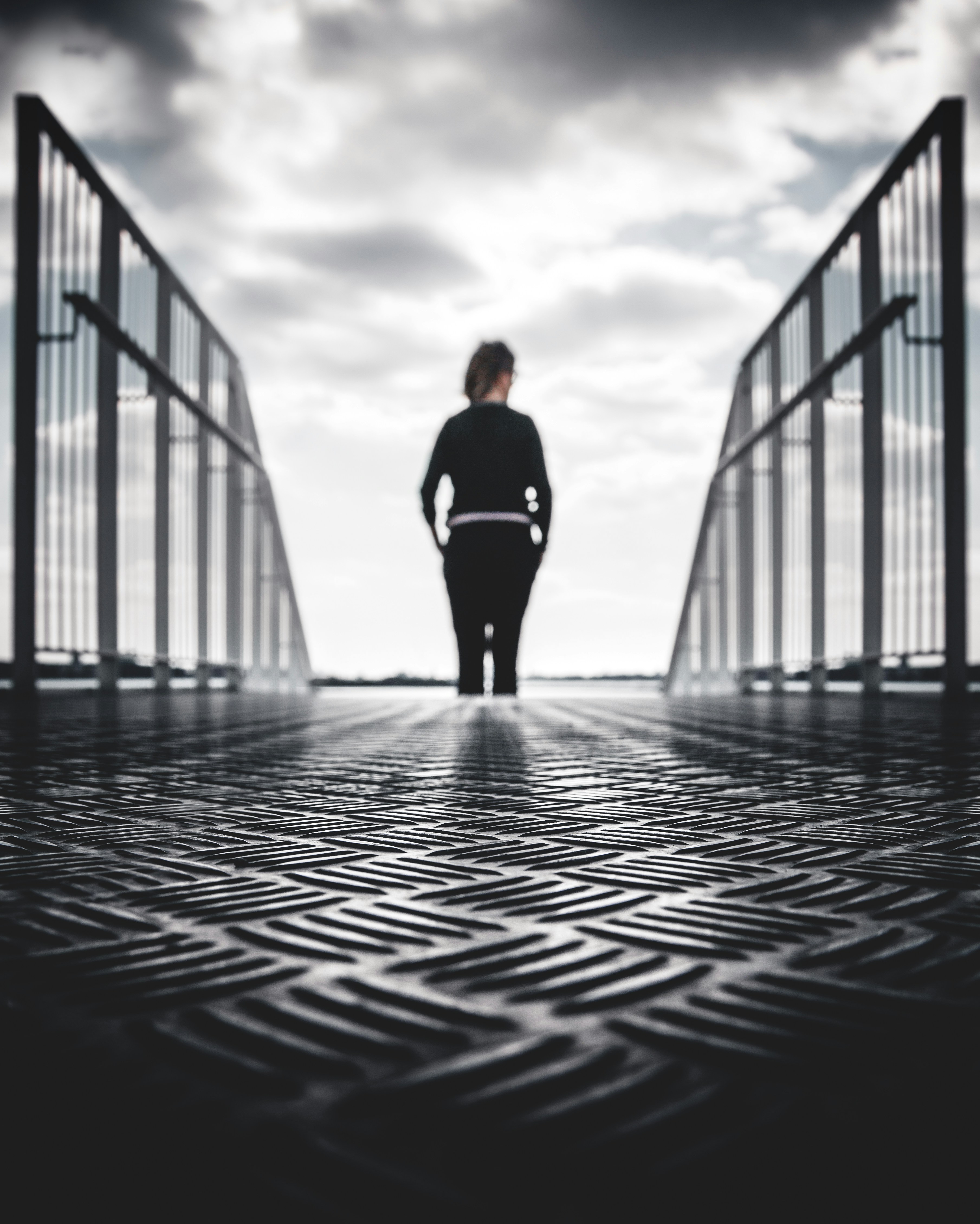 Grayscale Photo Of Woman In Between Gray Metal Railings Photo