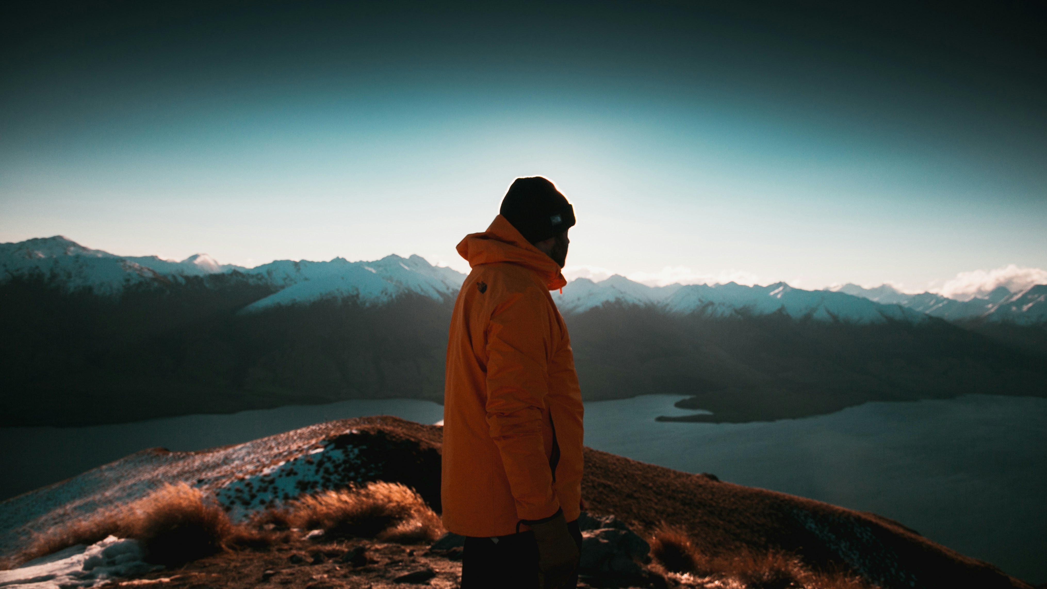 Man Wearing Orange Jacket Standing On Hill Viewing Mountain Photo