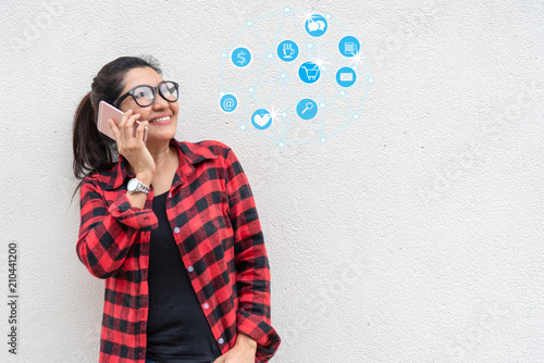 Middle Age Women With Red And Black Plaid Shirt Talking On Cell