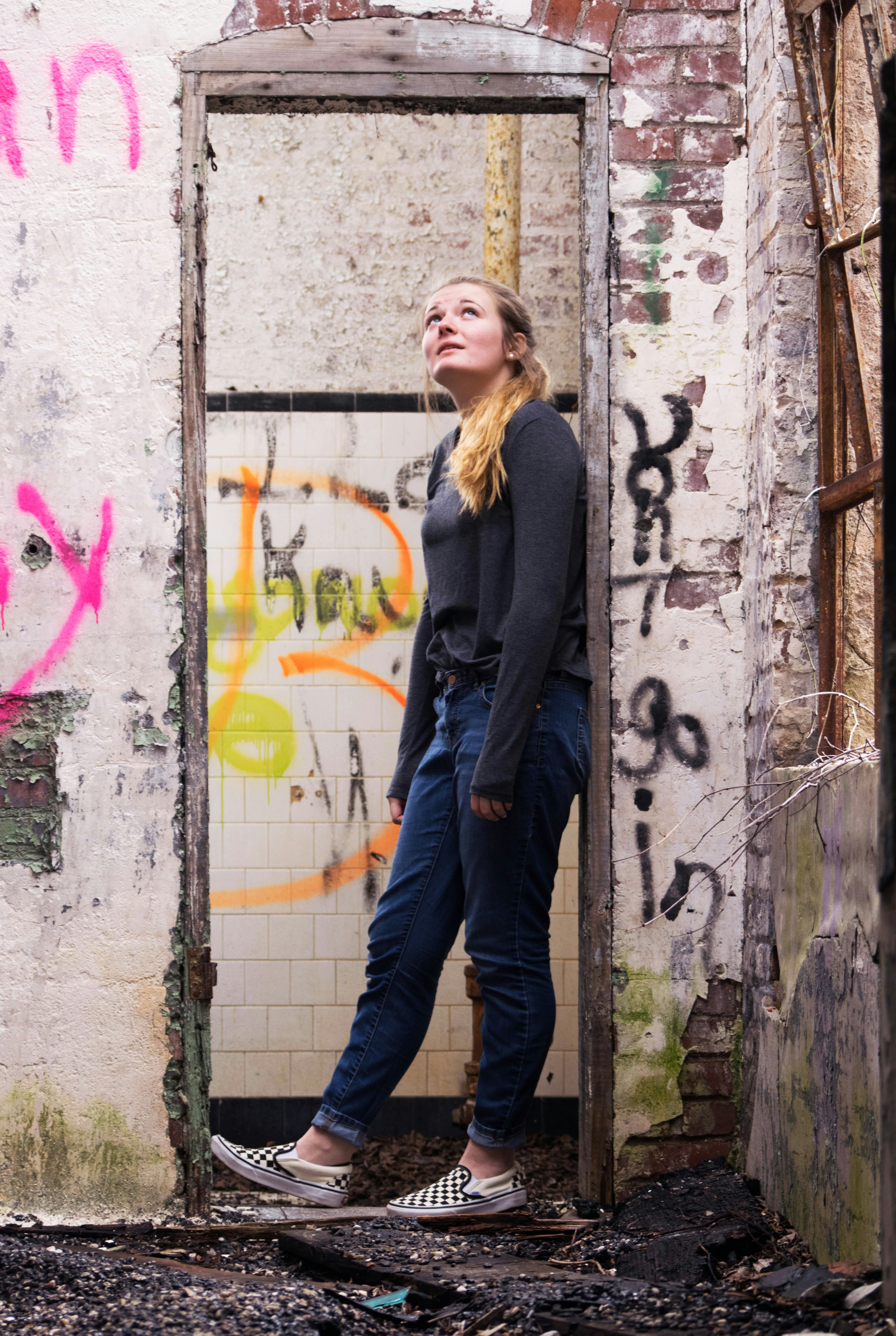 Woman Wearing Gray Long Sleeved Shirt And Blue Pants Photo Free