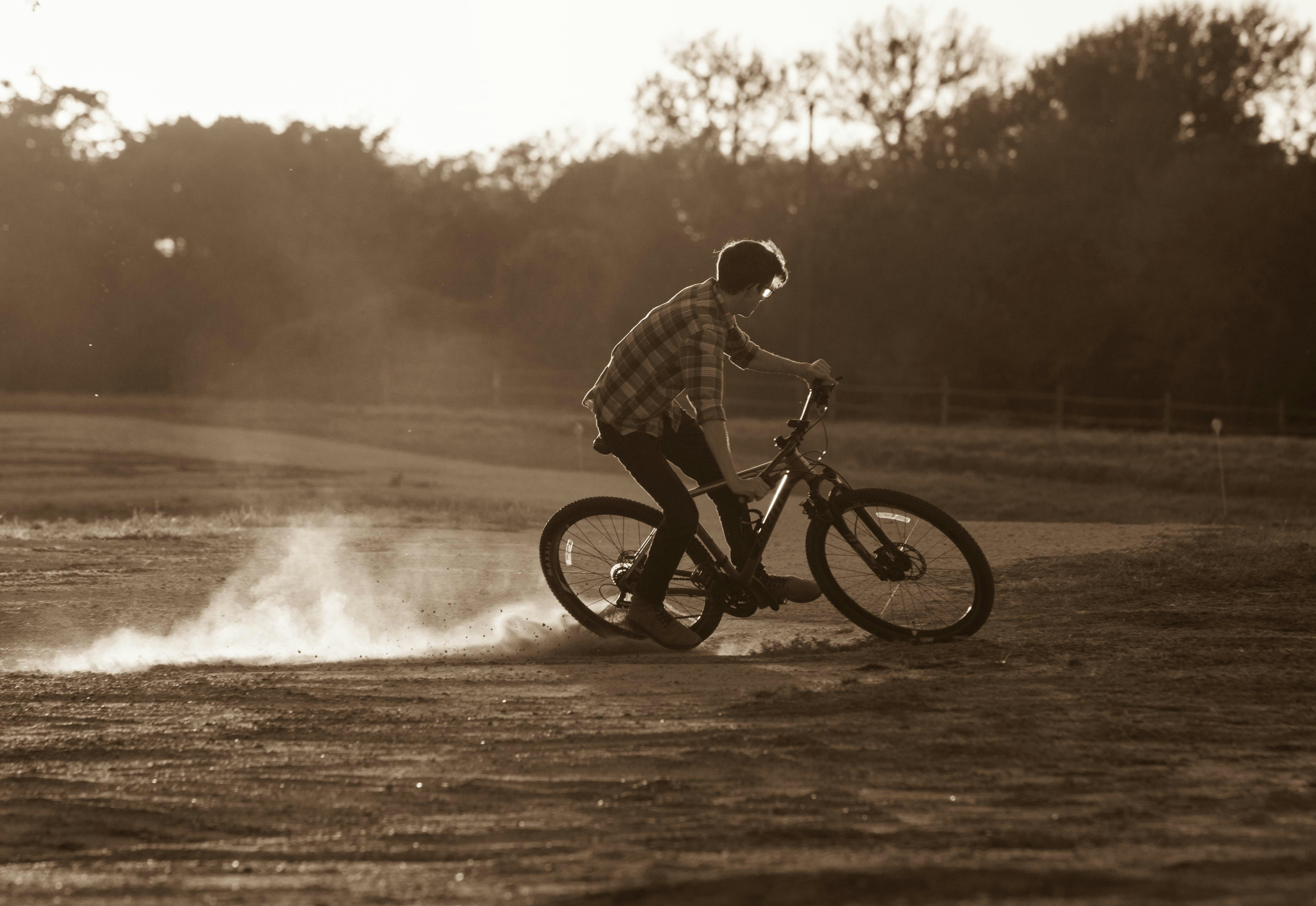 Grayscale Photo Of Person Riding Bicycle On Road Photo Free