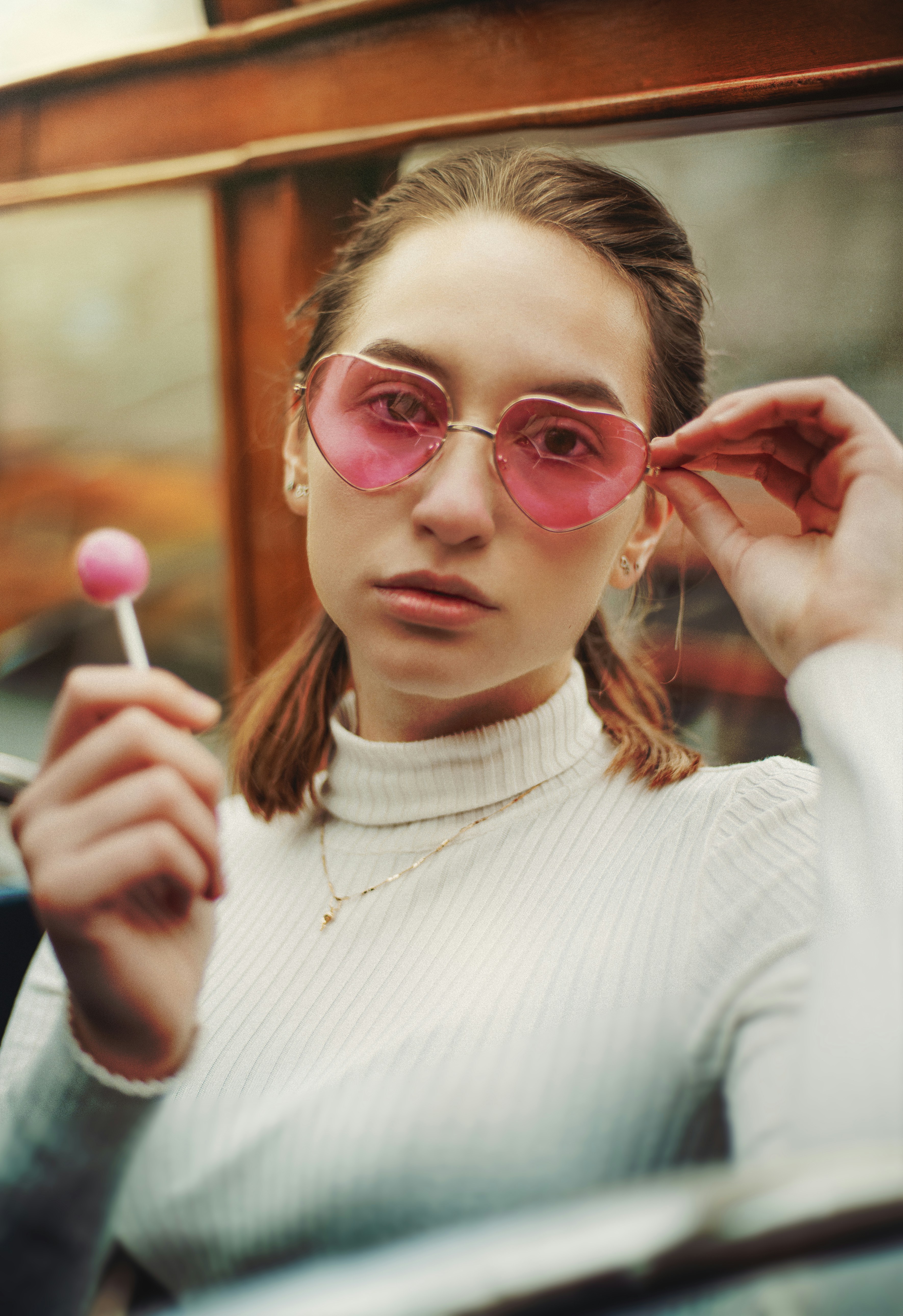 Woman In White Turtleneck Sweater Wearing Red Framed Eyeglasses
