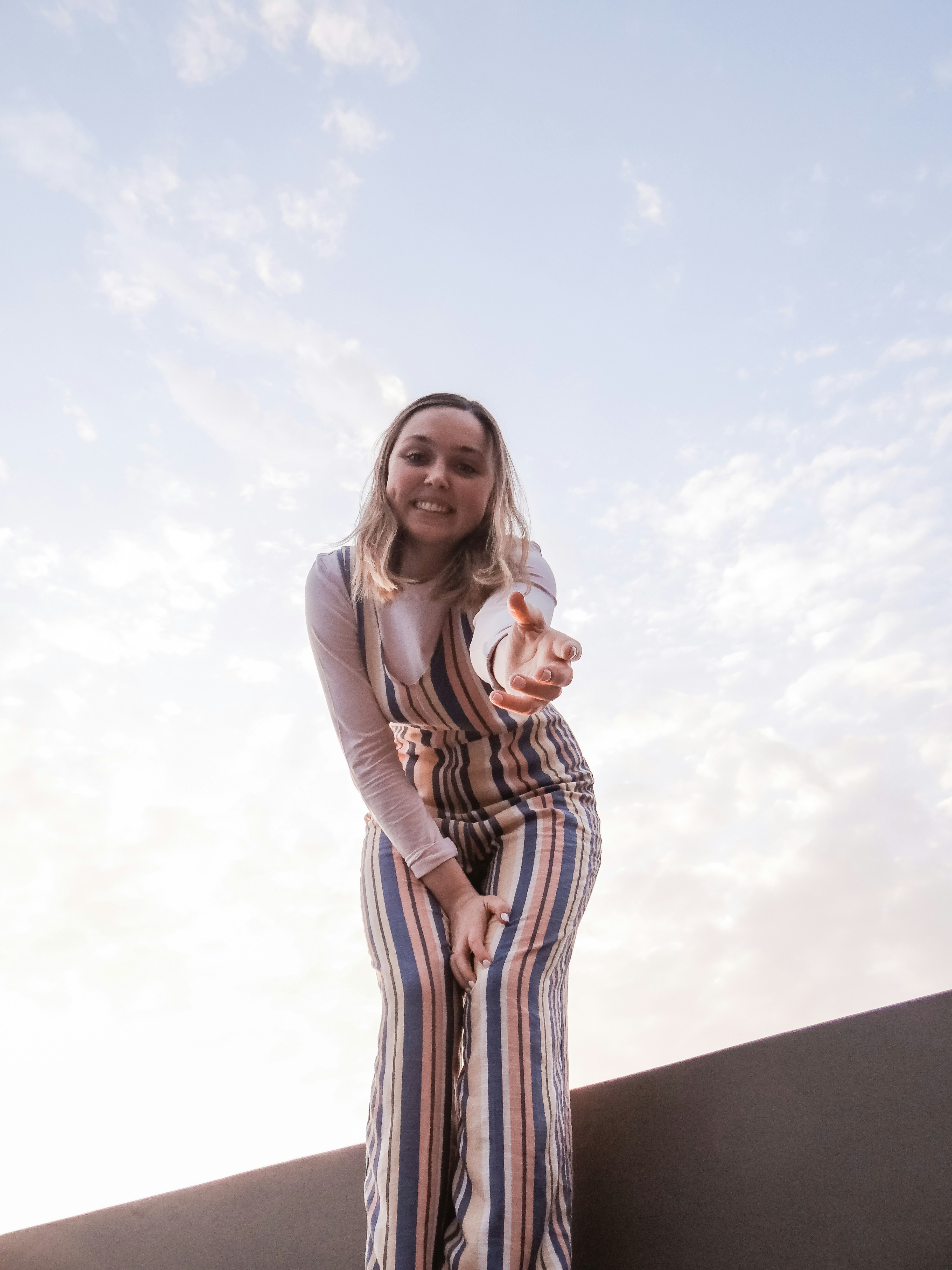 Woman In Multicolored Striped Jumpsuit And White Sweater Photo