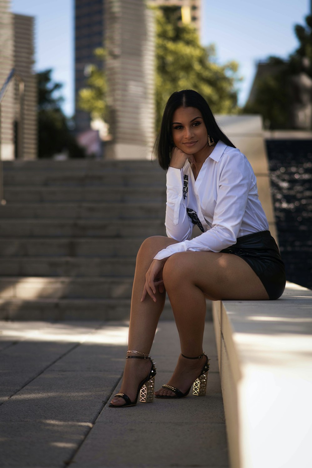 Woman In Black Long Sleeve Dress Sitting On Brown Concrete Bench