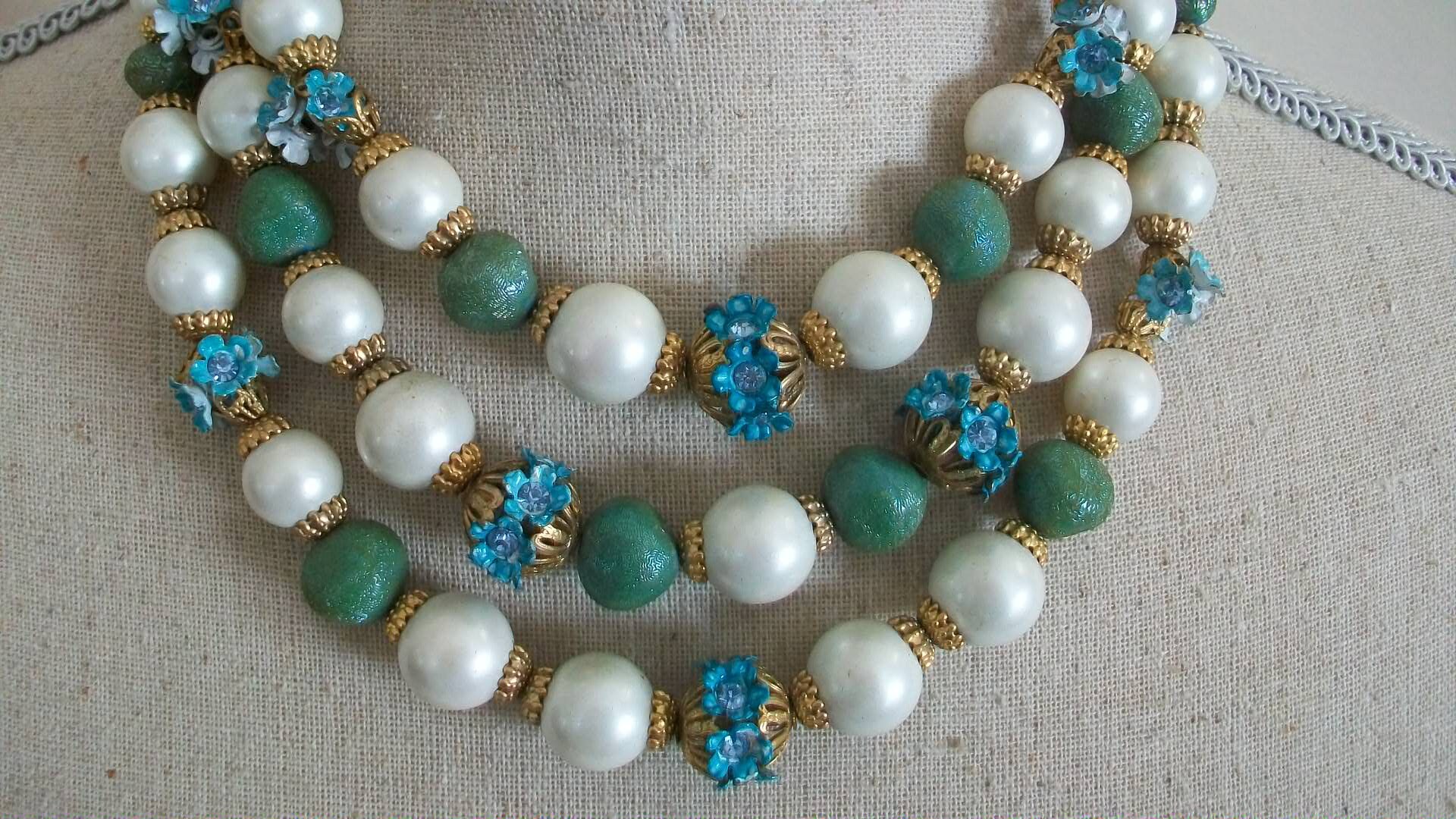 Large Faux Pearl And Beaded Necklace Three Strands Flower Etsy