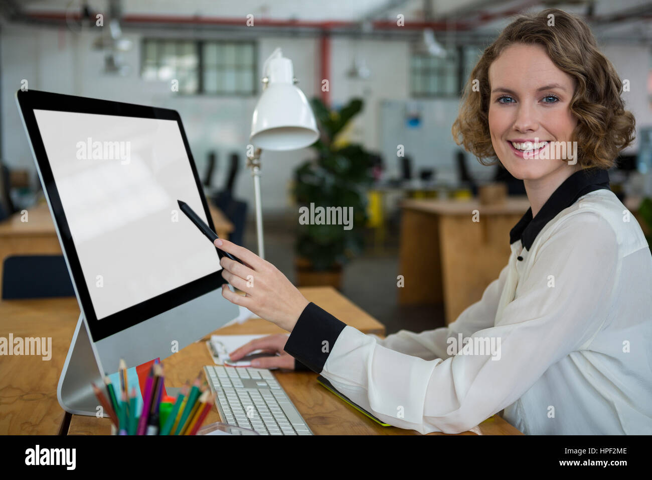 Portrait Of A Happy Woman Working On Desktop Pc In Creative Office
